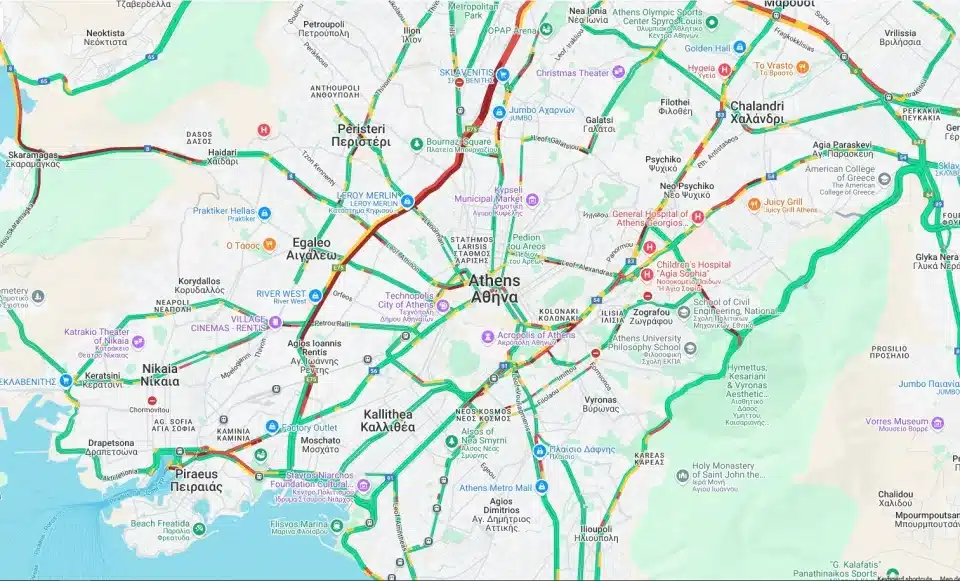 Πυκνή ροή υπάρχει και στο λιμάνι του Πειραιά και στους γύρω δρόμους από αυτό, ενώ προβλήματα διαπιστώνονται στα οχήματα που κινούνται στη Λεωφόρο Ποσειδώνος στο ρεύμα προς Πειραιά.