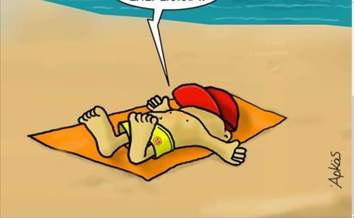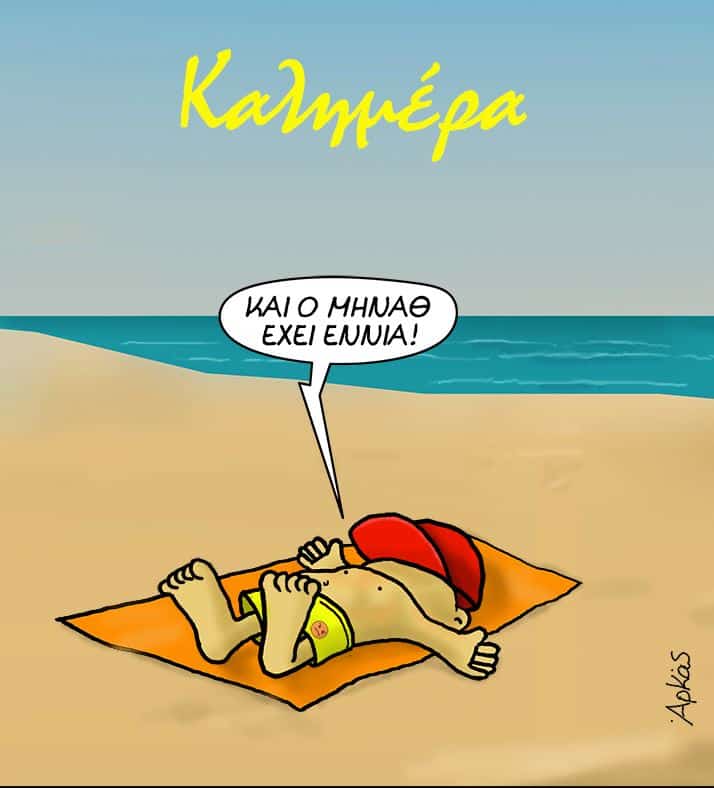 Στη σημερινή του «Καλημέρα», ο αγαπημένος σκιτσογράφος Αρκάς, μας χρησιμοποιεί ως πρωταγωνιστή τον μικρό Θανασάκη από την παραλία. Ξαπλωμένος ανάσκελα στην πετσέτα του, φορώντας το κόκκινο καπέλο του και απολαμβάνοντας τον ήλιο και τη θάλασσα, ο Θανασάκης αποτυπώνει την ουσία της ξεγνοιασιάς με μία και μόνο φράση: