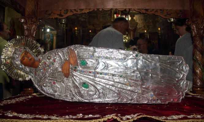 Όταν εκοιμήθη, με ψαλμούς και ύμνους την τοποθέτησαν στο μνήμα της στη Γεσθημανή. Ο μοναδικός που δεν ήταν παρών στο γεγονός ήταν ο Απόστολος Θωμάς.