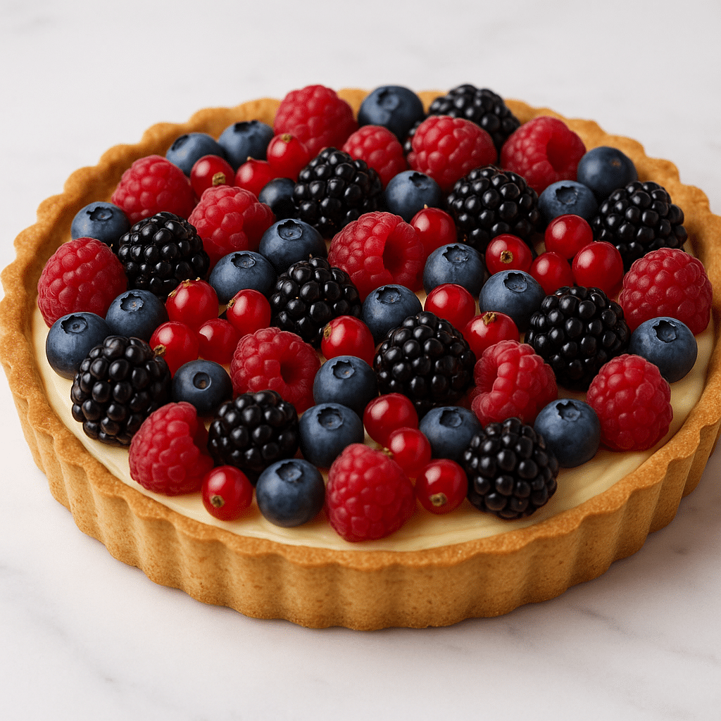 Αν αναζητάτε ένα επιδόρπιο που συνδυάζει δροσιά, φρουτένια γεύση και εντυπωσιακή εμφάνιση, αυτή η τάρτα με φρούτα του δάσους είναι η τέλεια επιλογή! Ιδανική για καλοκαιρινά τραπεζώματα, αλλά και για κάθε περίσταση που θέλετε να εντυπωσιάσετε. Η βουτυράτη βάση της τάρτας, η κρεμώδης γέμιση βανίλιας και τα φρέσκα φρούτα του δάσους δημιουργούν έναν απολαυστικό συνδυασμό.