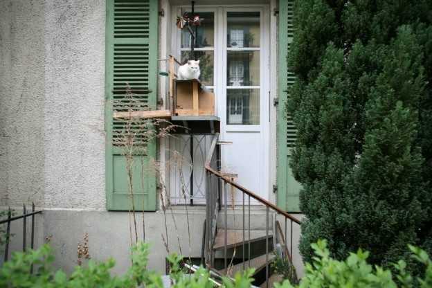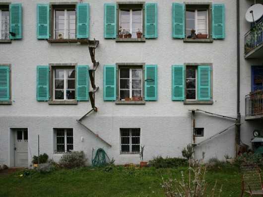 Σε εξωτερικούς τοίχους των σπιτιών, προσαρμόζουν μια ευρύτατη ποικιλία από σκάλες για γάτες: από μια κομψή ελικοειδή κατασκευή που βρίσκεται σε καταστήματα (και μόνο το ότι μια τέτοια κατασκευή βρίσκεται σε καταστήματα λέει πολλά για τη ζωοφιλία των Ελβετών) έως πιο χειροποίητες εμπνεύσεις που αξιοποιούν γραμματοκιβώτια ή κομμένους κορμούς δέντρων.