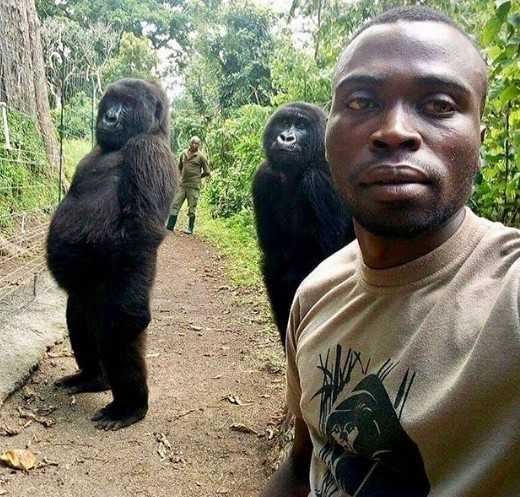Ο άνθρωπος που τα είχε σώσει όταν ήταν μωρά και αγωνίζεται κατά της λαθροθηρίας έβγαλε τη φωτογραφική μηχανή για να βγάλει μία σέλφι. Και τότε συνέβη το απίστευτο. Οι δύο γορίλες στήθηκαν για σέλφι.