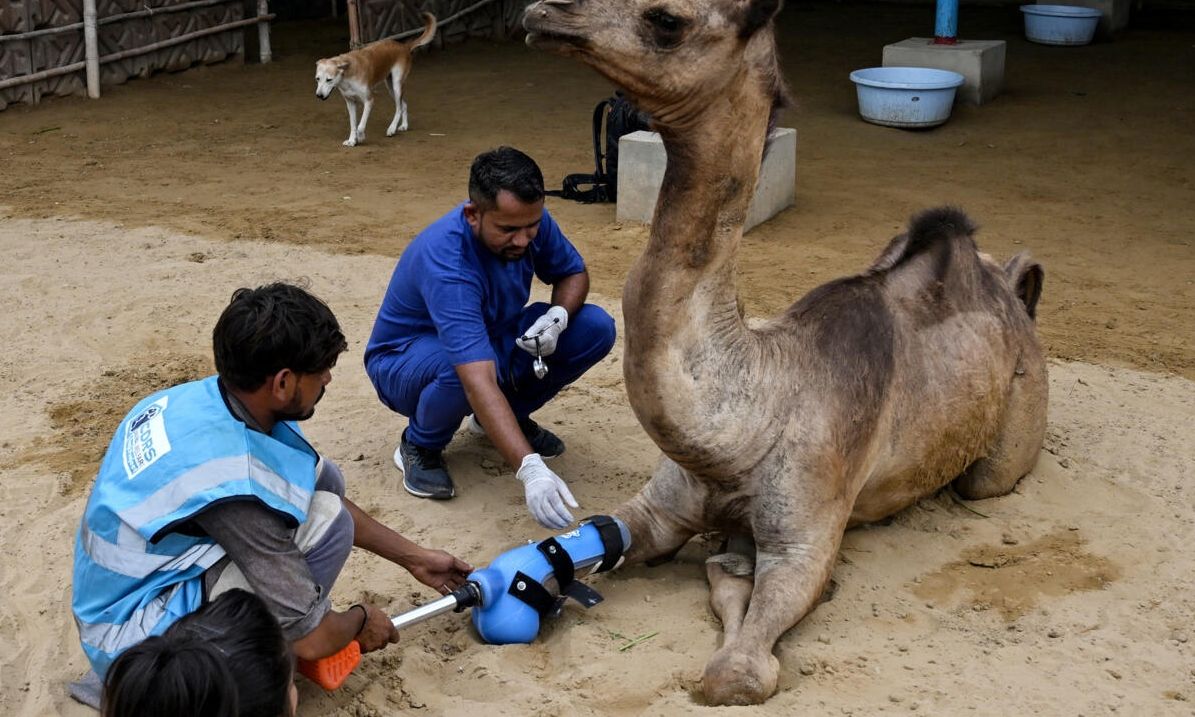 Οι φροντιστές της δάκρυσαν βλέποντάς την να στέκεται ξανά στα τέσσερα πόδια της: μια νεαρή καμήλα, το ένα πόδι της οποίας είχε κοπεί έναν χρόνο νωρίτερα, ξαναπερπατάει χάρη σε ένα προσθετικό μέλος, μια σπάνια επέμβαση για το Πακιστάν.