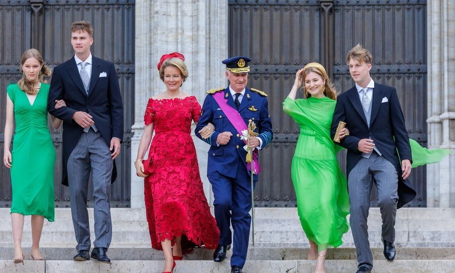 Η Βασιλική Οικογένεια του Βελγίου, η Πριγκίπισσα Ελεονώρα, ο Πρίγκιπας Γαβριήλ, η Βασίλισσα Ματθίλδη, ο Βασιλιάς Φίλιππος, η Πριγκίπισσα Ελισάβετ και ο Πρίγκιπας Εμμανουήλ, κατεβαίνουν τις σκάλες του Καθεδρικού Ναού των Αγίων Μιχαήλ και Γκουντούλα μετά τη Θεία Λειτουργία Te Deum για τον εορτασμό της Εθνικής Επετείου του Βελγίου στις Βρυξέλλες, Βέλγιο, 21 Ιουλίου 2025