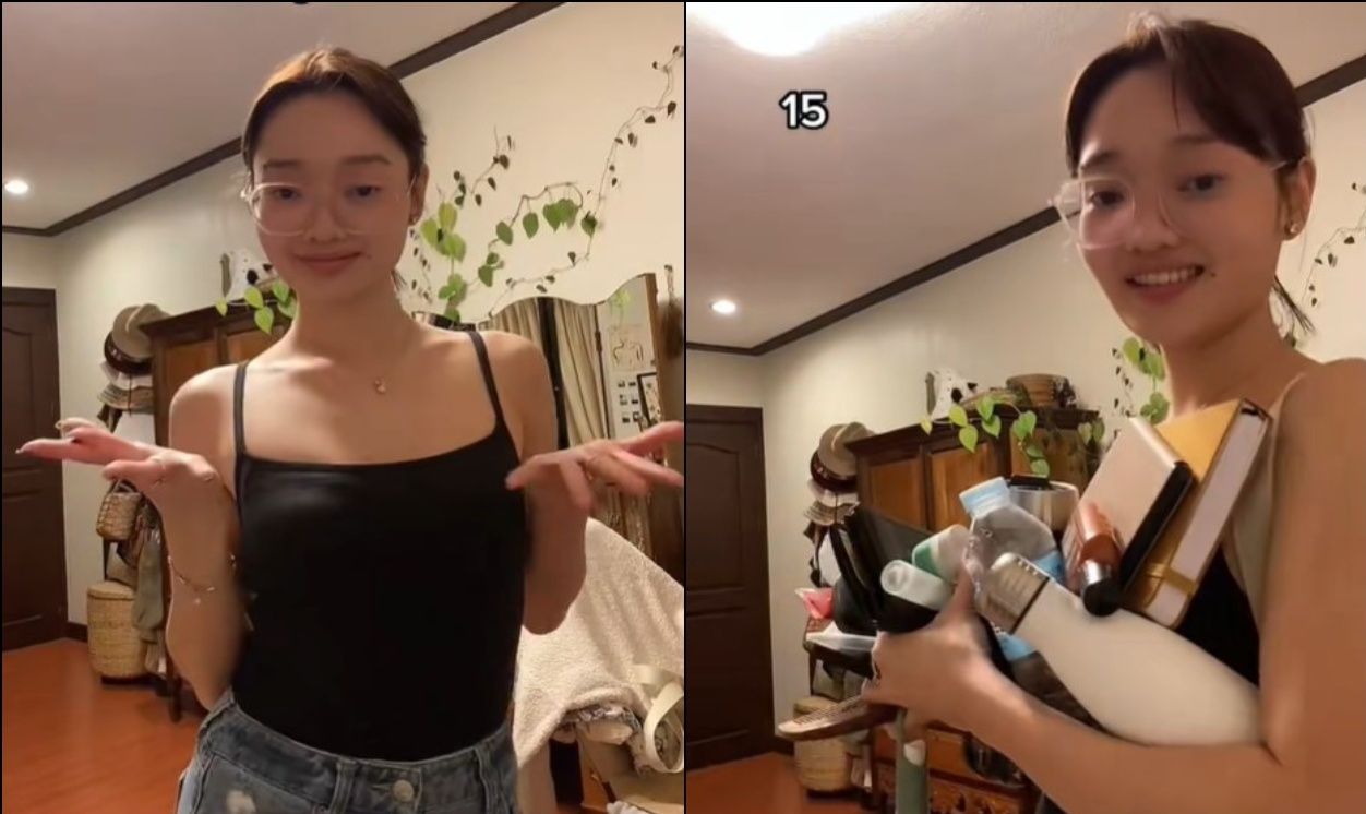 Στο παραπάνω βίντεο που έχει γίνει viral στο TikTok, η εν λόγω γυναίκα καταφέρνει να κουβαλήσει 15 αντικείμενα, όπως κραγιόν, στυλό, απολυμαντικό χεριών, πορτοφόλι, χτένα, μπουκάλια νερού κ.λπ.