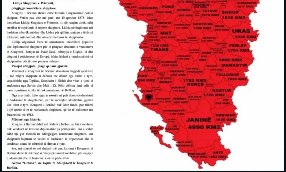 Σοβαρά ερωτήματα προκαλεί η δημοσίευση άρθρου στο επίσημο περιοδικό του Υπουργείου Άμυνας της Αλβανίας (Gazeta “Ushtria”), με αφορμή τα 147 χρόνια από το Συνέδριο του Βερολίνου. Συγκεκριμένα, το άρθρο συνοδεύεται από χάρτη που παρουσιάζει εκτεταμένα ελληνικά εδάφη ως “ιστορικές αλβανικές περιοχές”, με αναγραφή ονομάτων και εκτάσεων σε τετραγωνικά χιλιόμετρα.