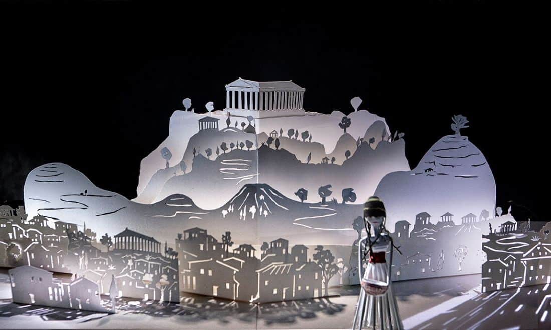 Η δημιουργός Δήμητρα Πεμούση ζωντανεύει τον γνωστό σε όλους μας μύθο μέσα από ένα χάρτινο τρισδιάστατο κουκλοθέατρο που βλέπουμε για πρώτη φορά στην Ελλάδα. Η ιστορία του πολυμήχανου εφευρέτη, παρουσιάζεται μέσα από εναλλασσόμενες σκηνές, τρισδιάστατες κατασκευές, κινούμενο πανόραμα-τεχνική crankie scroll, κούκλες και αντικείμενα φτιαγμένα με τις παραδοσιακές ιαπωνικές τεχνικές Origami και Kirigami. Το ιδιαίτερο εικαστικό σύμπαν συμπληρώνεται από ατμοσφαιρικούς φωτισμούς και μουσικές και ηχητικές μεταμορφώσεις, δημιουργώντας ένα μοναδικό, ονειρικό θέαμα, που μας ταξιδεύει σε κόσμους και ιστορίες μυθολογικές.