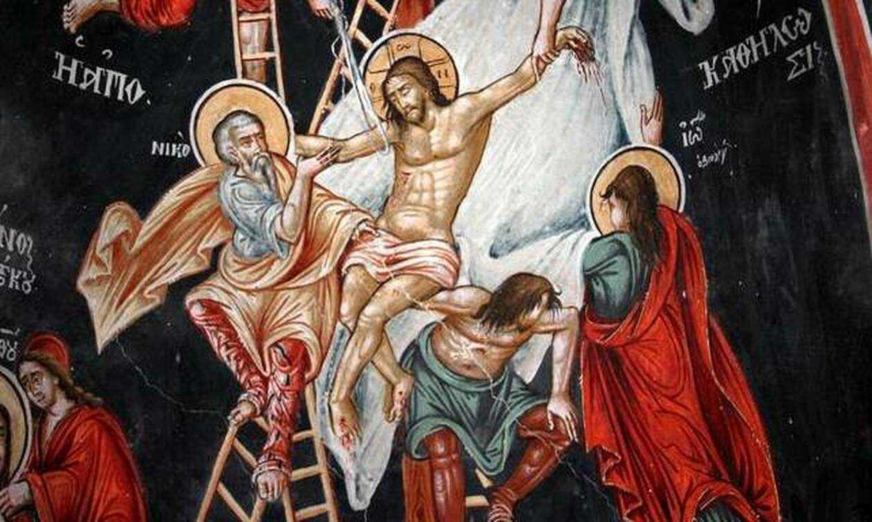 Το δεσποτικό αυτό θάνατο και η άψυχη κτίση, πενθώντας, τον τρέμει και αλλοιώνεται από το φόβο αλλά ο Δημιουργός της κτίσεως ακόμα και όταν είναι νεκρός, λογχίζεται την ακήρατη πλευρά Του και ρέει απ’ αυτή αίμα και νερό. Τέλος, κατά τη δύση του ηλίου, έρχεται ο Ιωσήφ από Αριμαθείας και ο Νικόδημος μαζί με αυτόν, και οι δυο κρυφοί μαθητές του Ιησού, αποκαθηλώνουν από το Σταυρό το πανάγιο του διδασκάλου σώμα, το αρωματίζουν, το τυλίγουν με καθαρό σεντόνι και αφού το έθαψαν σε καινούργιο τάφο, κυλούν στο στόμιο του μεγάλο λίθο.