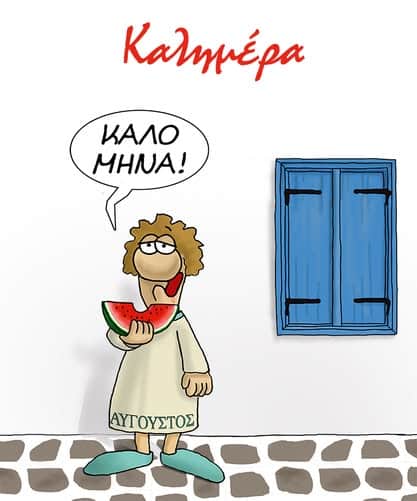 Ο Αρκάς, καλωσορίζει τον Αύγουστο μέσα από ένα καλοκαιρινό σκίτσο που αποπνέει ξεγνοιασιά, διακοπές και… καρπούζι. Ο ήρωας φοράει το χαρακτηριστικό του χιτώνιο με την ένδειξη «ΑΥΓΟΥΣΤΟΣ», κρατά μια ζουμερή φέτα καρπούζι και μας λέει δυνατά: «ΚΑΛΟ ΜΗΝΑ!».