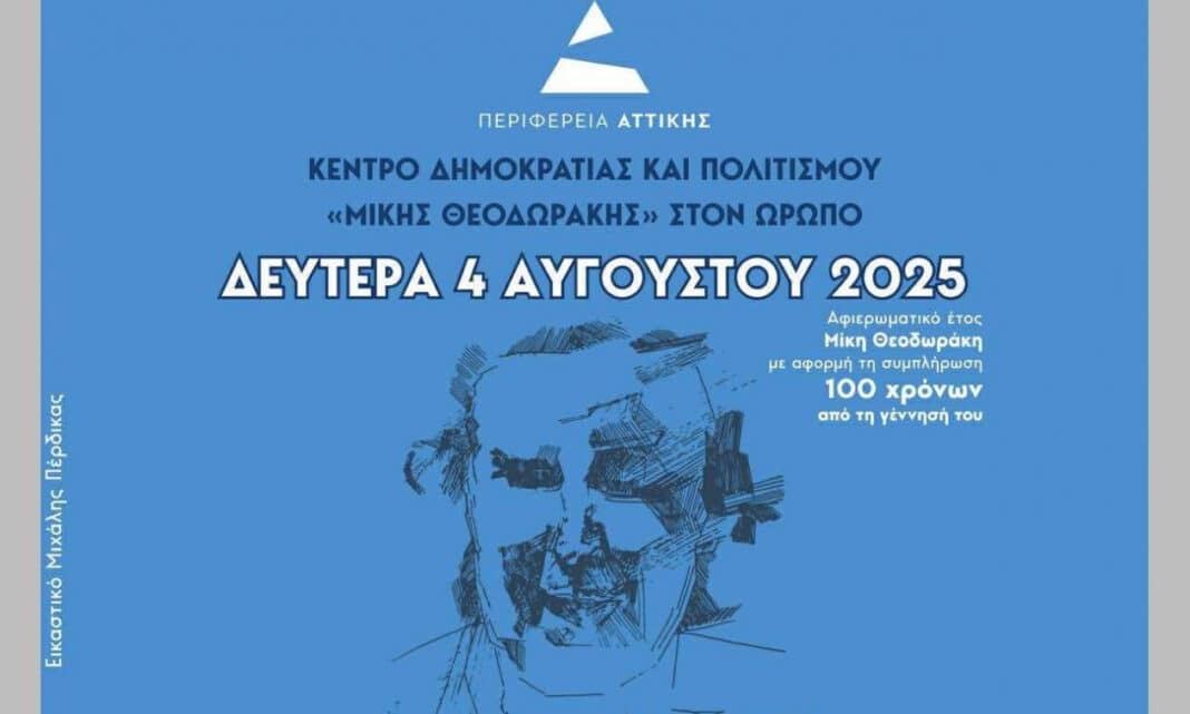 Η Περιφέρεια Αττικής, σε συνεργασία με τον Δήμο Ωρωπού, διοργανώνει μεγάλη αφιερωματική συναυλία για τα 100 χρόνια από τη γέννηση του Μίκη Θεοδωράκη, τη Δευτέρα 4 Αυγούστου και ώρα 21.00 στο Κέντρο Ιστορίας, Δημοκρατίας και Πολιτισμού, εντός του ιστορικού χώρου των Παλαιών Φυλακών Ωρωπού.