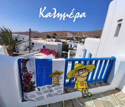 Ο Αρκάς, με φόντο το απέραντο γαλάζιο και την κυκλαδίτικη αισθητική, ο αγαπημένος μας καλημερίζει με ένα σκίτσο που «μυρίζει» καλοκαίρι, ήλιο και ξεκούραση. Ο Θανασάκης, φορώντας το καπέλο του και τις παντόφλες του, αράζει νωχελικά μπροστά από ένα λευκό κυκλαδίτικο σπιτάκι, ενσαρκώνοντας την απόλυτη ανεμελιά των διακοπών.