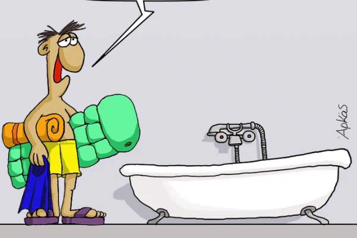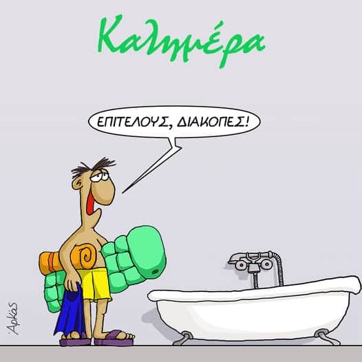 Στο σημερινό του σκίτσο, ο ήρωας εμφανίζεται έτοιμος για παραλία: μαγιό, βατραχοπέδιλα, πετσέτα, φουσκωτό στρώμα. Όλα δείχνουν πως ετοιμάζεται να φύγει για τις πολυπόθητες διακοπές. Όμως… υπάρχει μια ανατροπή.