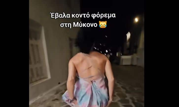 Στο βίντεο που έγινε viral, γυναίκα που βρίσκεται στο νησί περπατάει σε ένα από τα χαρακτηριστικά δρομάκια του, τραβώντας συνεχώς το φόρεμά της προς τα κάτω, για να μην της το σηκώσει ο ισχυρός άνεμος, με τους χρήστες να σχολιάζουν ότι στη Μύκονο «φυσάει μόνο δύο φορές τον χρόνο… και η μία κρατάει έξι μήνες!».