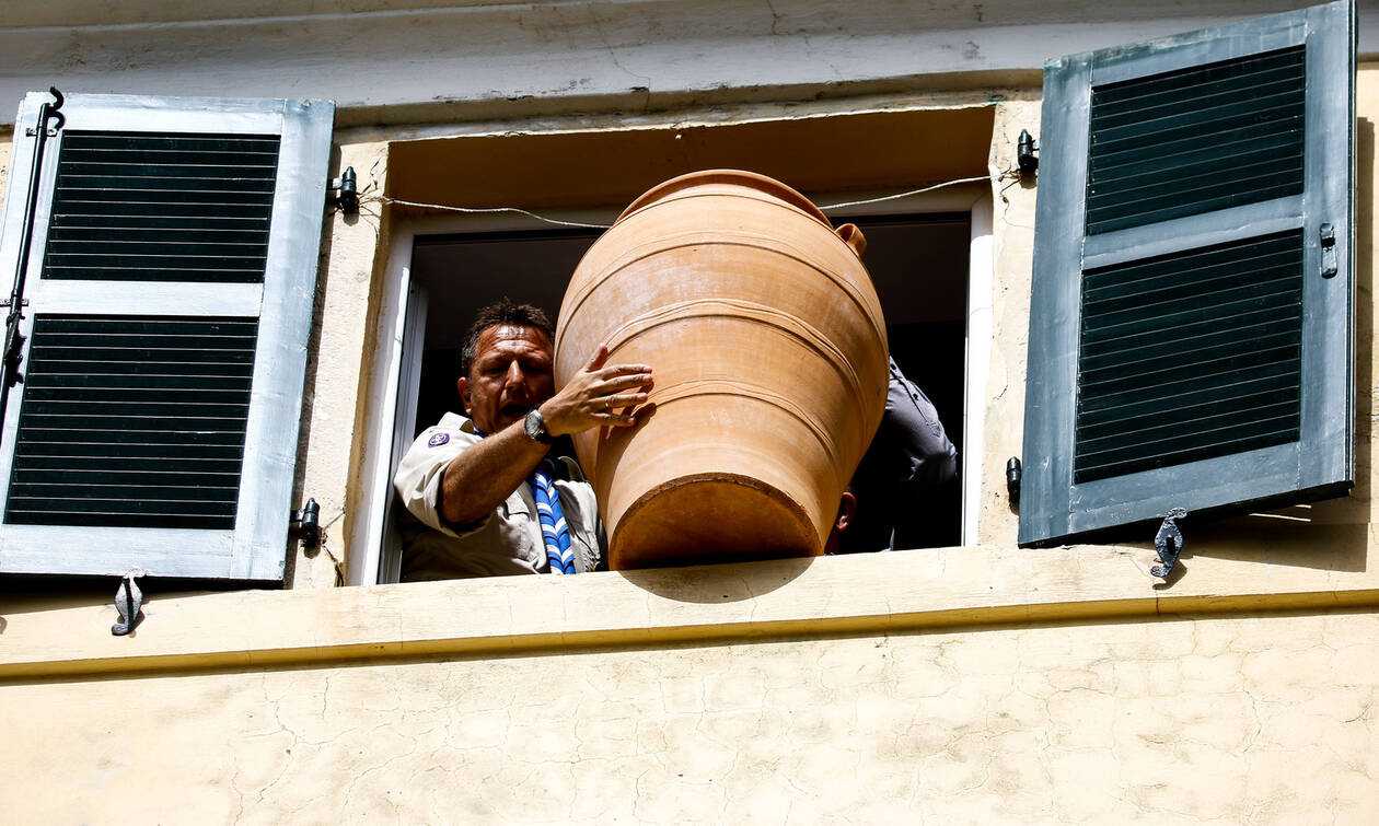 Εκατοντάδες «μπότηδες» γεμάτοι νερό, με στενό στόμιο και δυο χερούλια στο πλάι για τη μεταφορά τους, δεμένα με κόκκινες κορδέλες σκάνε στο έδαφος πέφτοντας από τα ψηλά παραθυρόφυλλα.