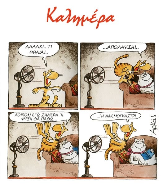 Με το γνωστό του χιούμορ, ο Αρκάς σήμερα επιστρατεύει την αγαπημένη Λουκρητία η οποία ζεσταίνεται και χουζουρεύει προσπαθώντας να δροσιστεί με τον ανεμιστήρα.