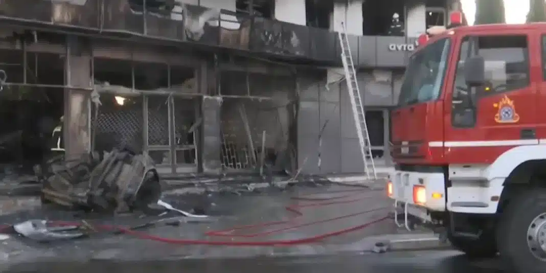 Από τη σύγκρουση ξέσπασε μεγάλη φωτιά, η οποία κατέστρεψε ολοσχερώς τόσο το ΙΧ όσο και το κατάστημα, επεκτεινόμενη στον ισόγειο και τον πρώτο όροφο του κτιρίου.