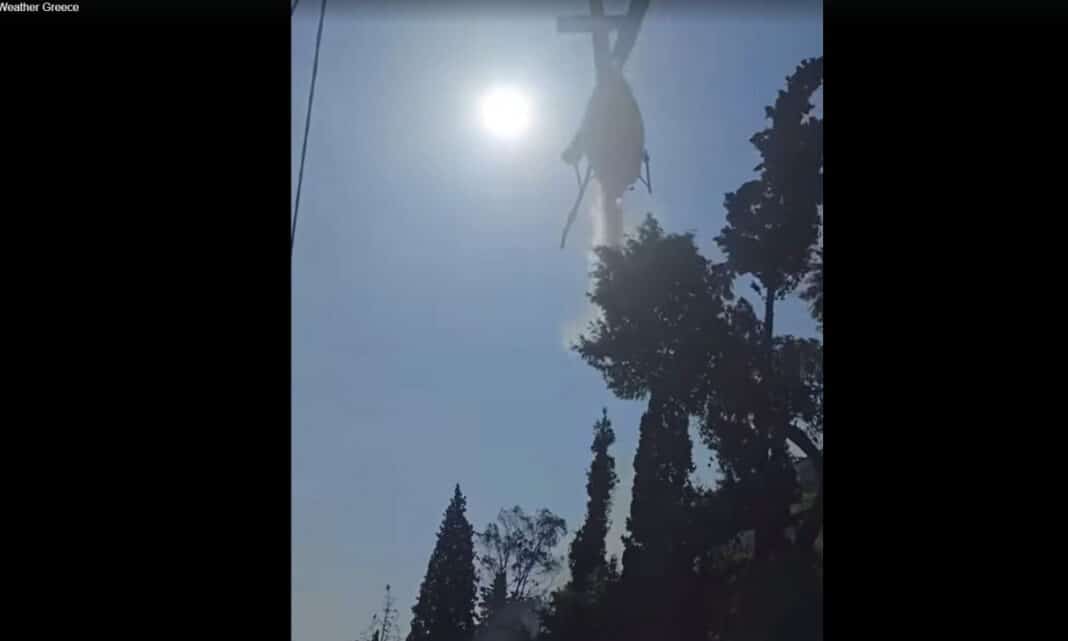 Το βίντεο δείχνει και τα σπασμένα κλαριά από τον στροβιλισμό του αέρα που προκάλεσε ο έλικας του ελικοπτέρου.