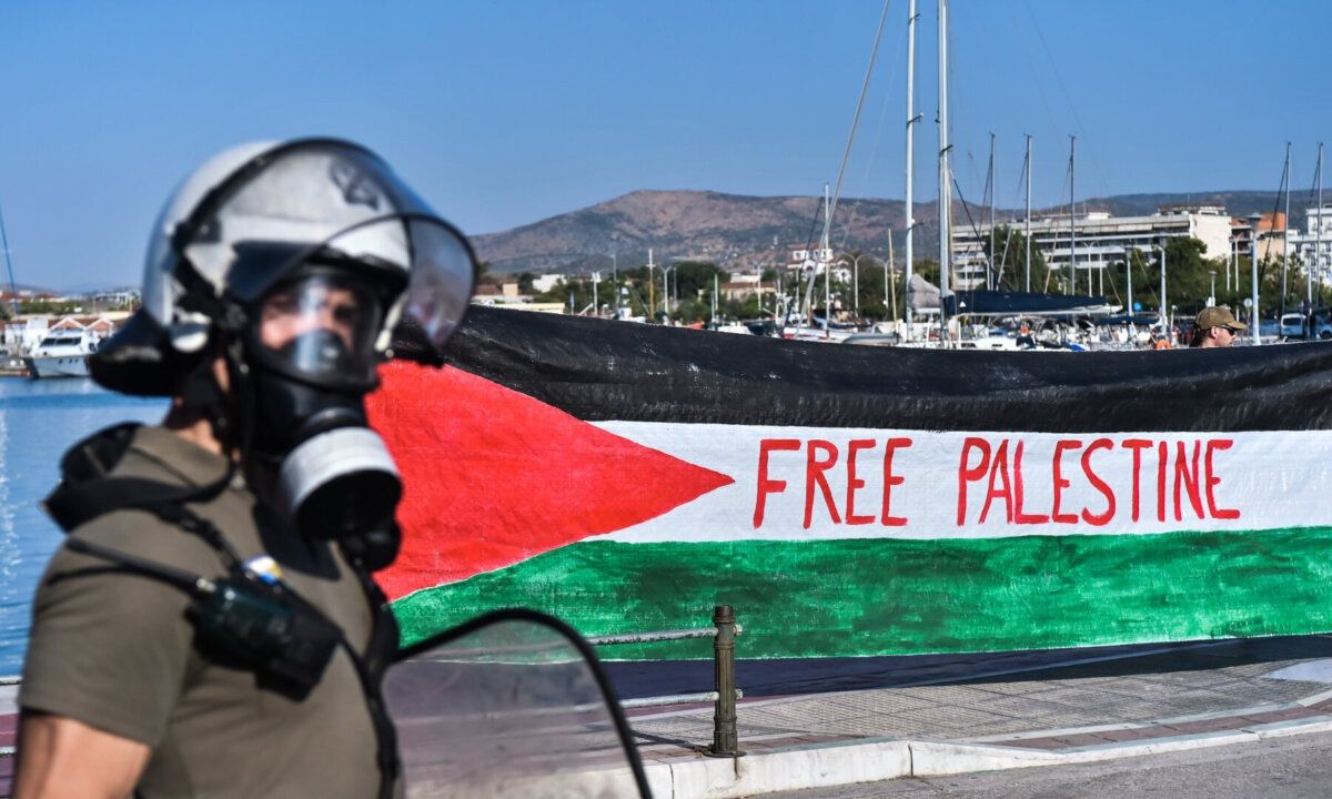 Δεκάδες διαδηλωτές συγκεντρώθηκαν στην περιοχή των Παλαιών Βόλου, διαμαρτυρόμενοι για την παρουσία Ισραηλινών επιβατών του κρουαζιερόπλοιου Crown Iris, που κατέπλευσε νωρίτερα στο λιμάνι της πόλης
