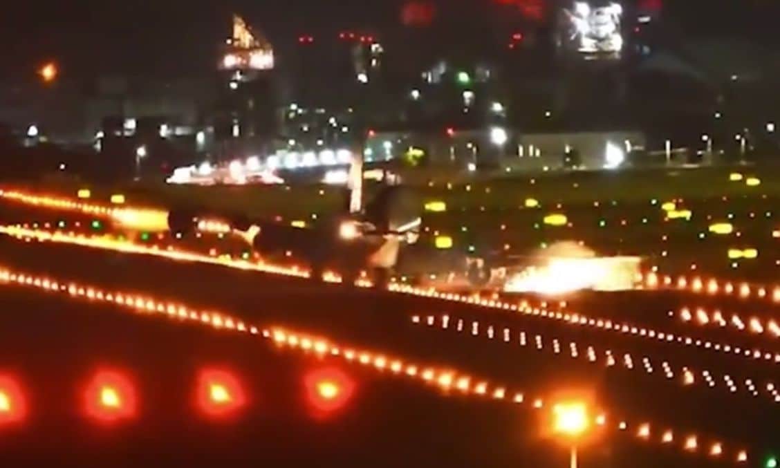 Τρομακτικές στιγμές στο αεροδρόμιο της Ταϊπέι, όπου το φτερό ενός φορτηγού αεροσκάφους Boeing 747 χτύπησε το έδαφος κατά την προσγείωση, με σπίθες να εκτοξεύονται και να φωτίζουν τον διάδρομο.