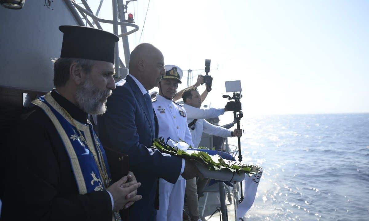 Ο κ. Δένδιας, σε δεύτερη ανάρτηση στο κοινωνικό δίκτυο Χ, τονίζει ότι παραβρέθηκε στην επιμνημόσυνη δέηση επί του ταχέως περιπολικού κατευθυνόμενων βλημάτων «Μυκόνιος» στη θαλάσσια περιοχή της Τήνου και «στη ρίψη στεφάνου στον υγρό τάφο των πεσόντων του καταδρομικού ‘Έλλη’ κατά τον τορπιλισμό στις 15/8/1940».