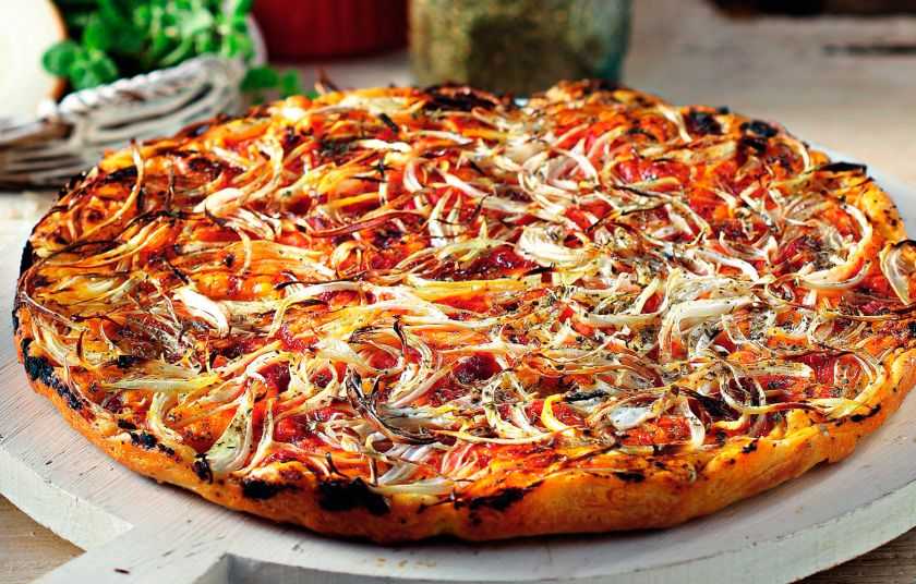 Προθερμαίνουμε το φούρνο στους 200° C, προτιμότερο στη λειτουργία του αέρα. Λαδώνουμε με 30 ml από το ελαιόλαδο ένα ταψί διαμέτρου περίπου 38 εκ. ή τη λαμαρίνα του φούρνου. Ανοίγουμε με τα δάχτυλά μας τη ζύμη σε διάμετρο περίπου 38 εκ. και τη μεταφέρουμε στο ταψί. Απλώνουμε το μείγμα του πελτέ ομοιόμορφα με τη ράχη ενός κουταλιού. Σκορπίζουμε τα κρεμμύδια και περιχύνουμε με το υπόλοιπο ελαιόλαδο. Πασπαλίζουμε με τη ρίγανη, το χοντρό αλάτι και φρεσκοτριμμένο πιπέρι και ψήνουμε για περίπου 20 λεπτά στη χαμηλότερη θέση του φούρνου, μέχρι να καραμελώσουν ελαφρώς τα κρεμμύδια στην επιφάνεια, αλλά να ροδίσει η ζύμη και από κάτω. Ελέγχουμε ανασηκώνοντας προσεκτικά μια άκρη της.