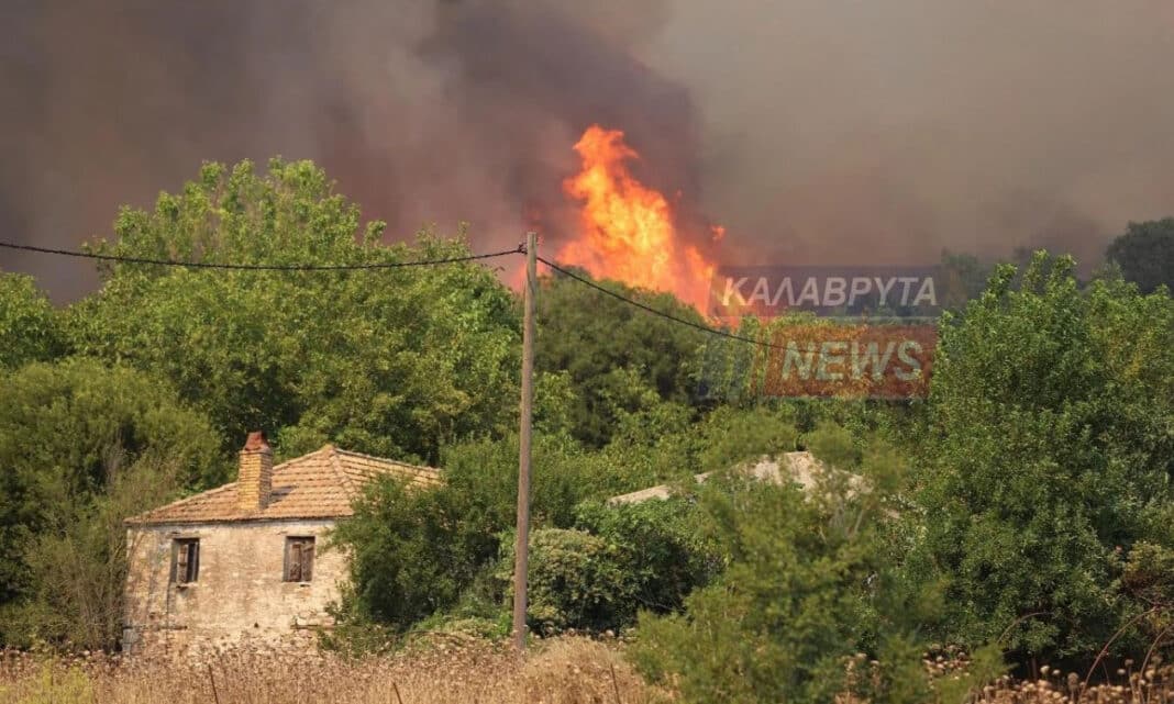 Σύμφωνα με πληροφορίες του kalavrytanews.gr η πυρκαγιά έφτασε μια ανάσα από τον οικισμό απειλώντας σπίτια και ποιμνιοστάσια.