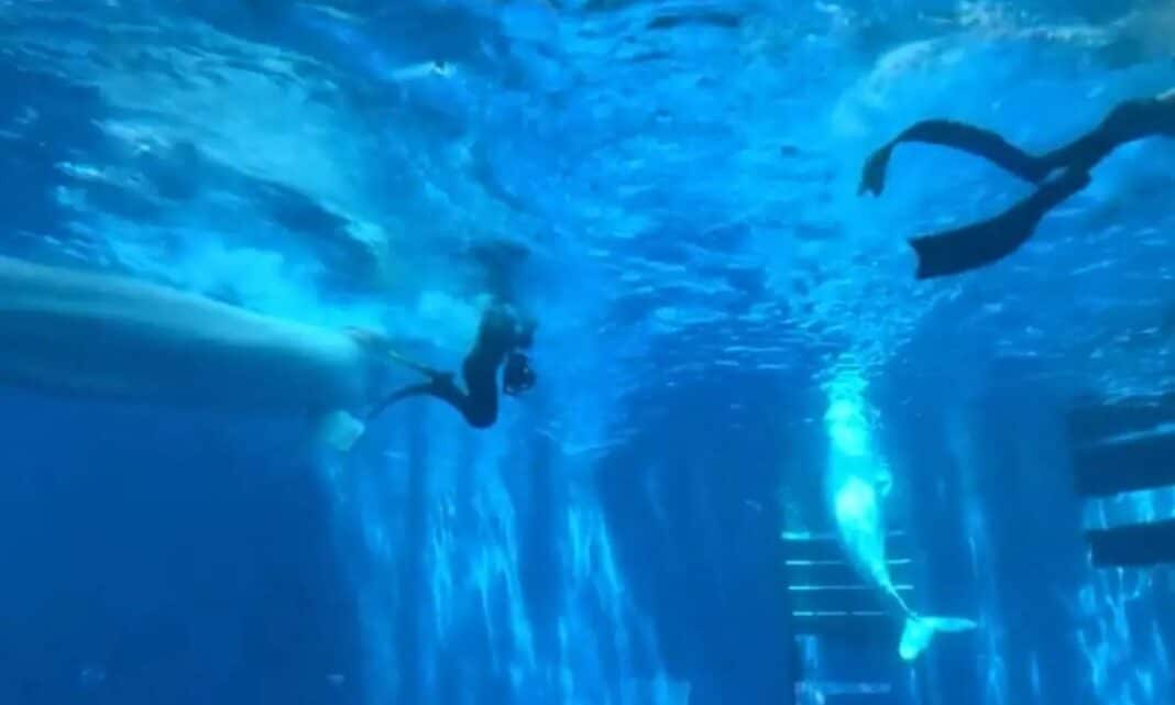 Το βίντεο που έγινε viral δείχνει τη τρομακτική στιγμή που μια φάλαινα μπελούγκα προσπάθησε να δαγκώσει δύο δύτες που βρίσκονταν κοντά της μέσα σε μια δεξαμενή στο Chengdu Haichang Polar Ocean Park στη Σιτσουάν της Κίνας, την Πέμπτη 14 Αυγούστου, σύμφωνα με ένα βίντεο της Viral Press.