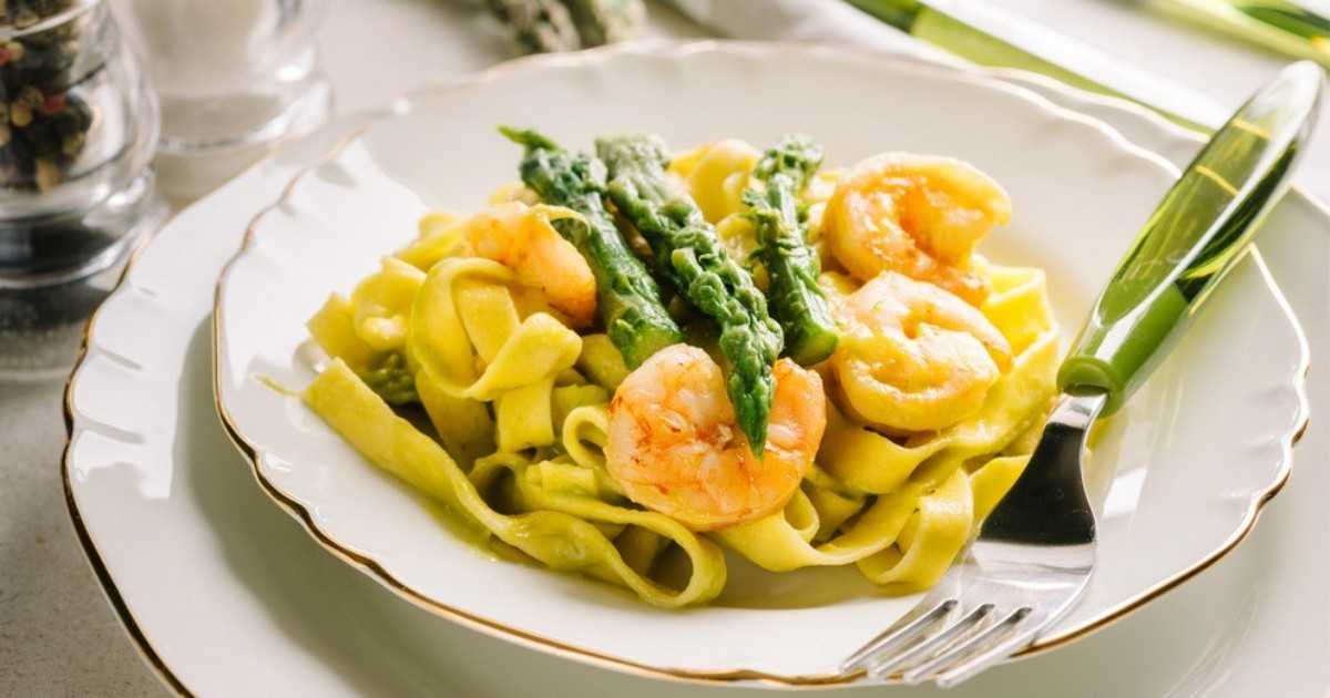 Ζεματίζετε τα σπαράγγια για 4’ – 5’ και τα στραγγίζετε καλά. Βράζετε τα ζυμαρικά σύμφωνα με τις οδηγίες της συσκευασίας τους και τα στραγγίζετε κι αυτά. Ανακατεύετε τα ζυμαρικά με τα σπαράγγια, τις γαρίδες και τον άνηθο.