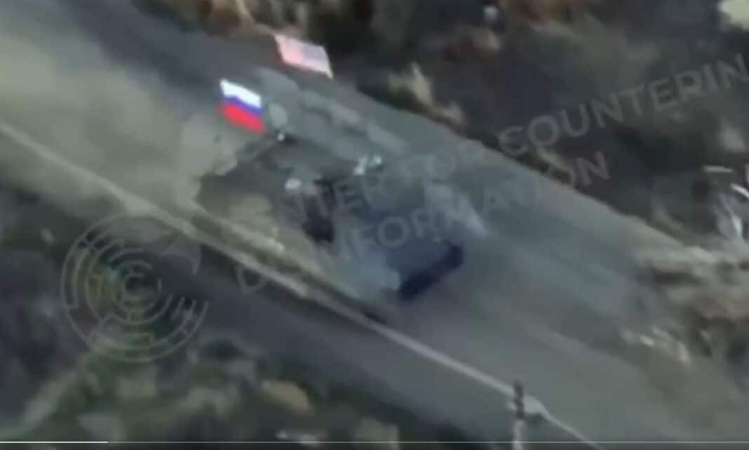 Στο εν λόγω βίντεο φαίνεται να δείχνει ένα θωρακισμένο όχημα μεταφοράς προσωπικού (APC) με τη ρωσική και την αμερικανική σημαία.