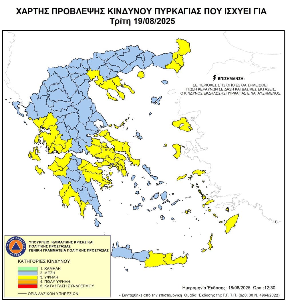 Ο Χάρτης Επικινδυνότητας που εκδίδει η Γενική Γραμματεία Πολιτικής Προστασίας του Υπουργείου Κλιματικής Κρίσης & Πολιτικής Προστασίας προβλέπει για σήμερα Τρίτη (19/8) ότι θα υπάρχει υψηλός κίνδυνος πυρκαγιάς σε αρκετές περιοχές της χώρας.