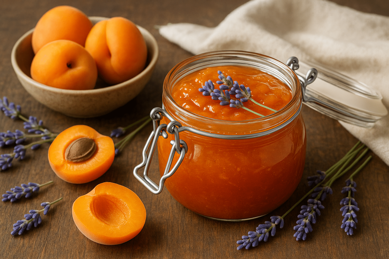 Το βερίκοκο είναι από τα πιο αρωματικά καλοκαιρινά φρούτα, και σε συνδυασμό με τη λεβάντα αποκτά μια ντελικάτη γεύση που θυμίζει μεσογειακό καλοκαίρι. Αυτή η μαρμελάδα είναι ιδανική για να συνοδεύσει το πρωινό σας, να αρωματίσει γιαούρτι ή να χρησιμοποιηθεί σε γλυκά.