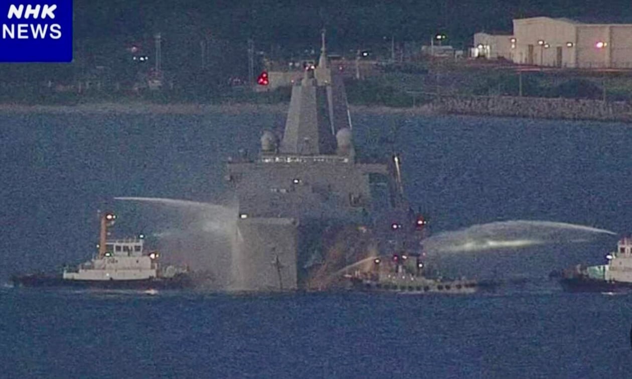 Πλάνα που μεταδόθηκαν από τον ιαπωνικό κρατικό τηλεοπτικό σταθμό NHK δείχνουν τις φλόγες να μαίνονται στο πλοίο κοντά στην βάση του αμερικανικού ναυτικού «White Beach» στην πόλη Uruma.