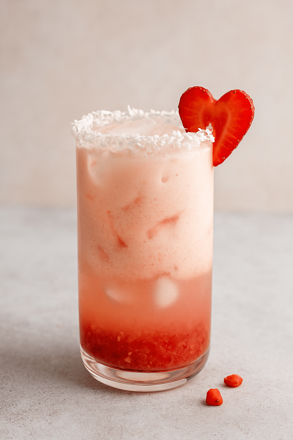 Γαρνίρετε με τριμμένη καρύδα στο χείλος του ποτηριού και μια φράουλα-καρδιά.