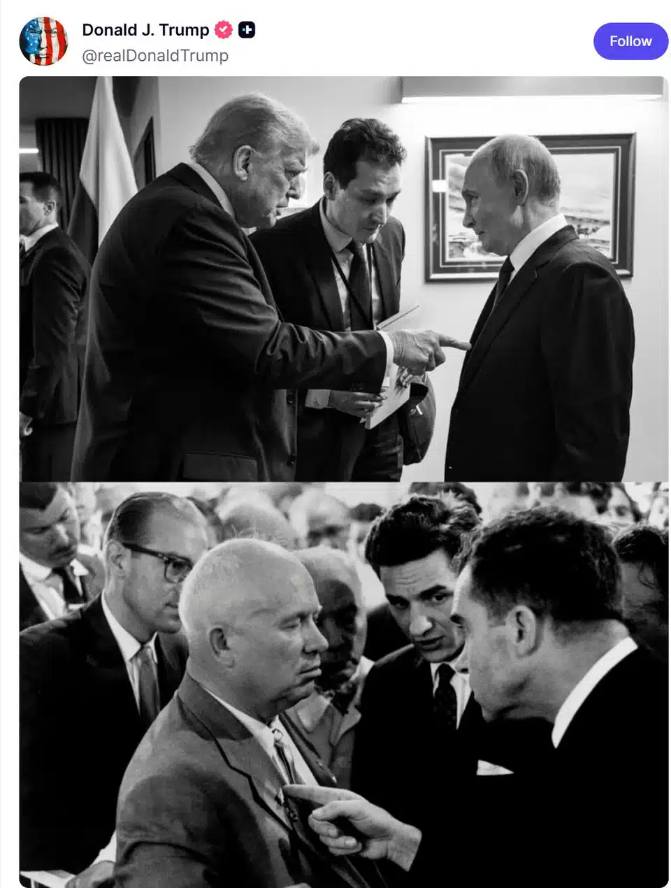 Μαζί με το σχόλιό του, ο Τραμπ ανάρτησε και φωτογραφία του δίπλα στον Ρώσο πρόεδρο Βλαντίμιρ Πούτιν, μια κίνηση που ερμηνεύτηκε ως έμμεσο μήνυμα για τον τρόπο που βλέπει τη γεωπολιτική αντιπαράθεση ΗΠΑ – Ρωσίας. Αναλυτές υπογραμμίζουν ότι ο Τραμπ επιχειρεί να εμφανιστεί ως ηγέτης που μπορεί να διαπραγματευτεί σκληρά με το Κρεμλίνο, θυμίζοντας τις ψυχροπολεμικές ισορροπίες.