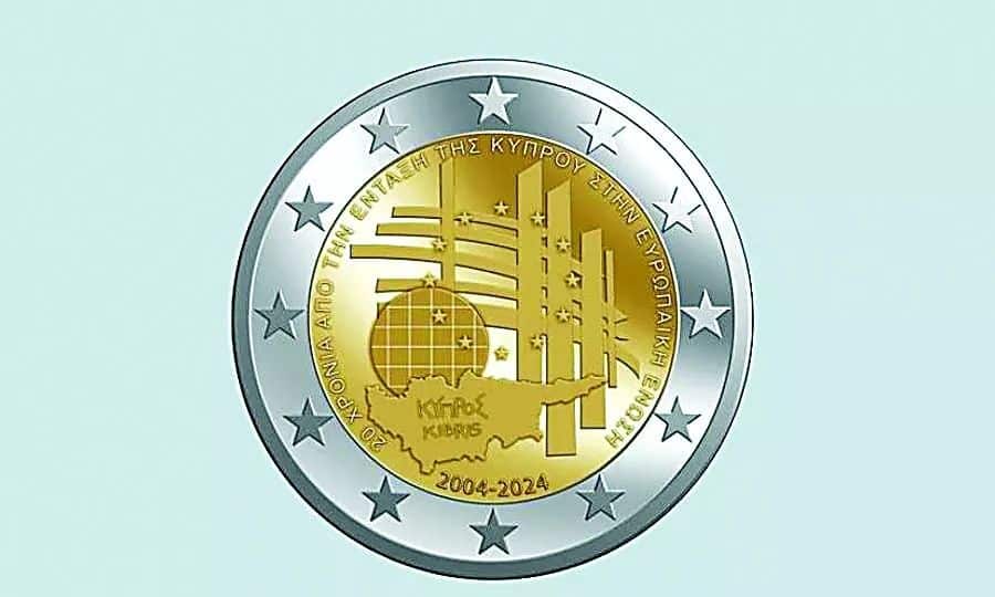 Ένα συλλεκτικό αναμνηστικό νόμισμα των 2 ευρώ από την Κεντρική Τράπεζα Κύπρου με αφορμή τη συμπλήρωση 20 χρόνων από την ένταξη της χώρας στην Ευρωπαϊκή Ένωση, έχει προκαλέσει σάλο στους συλλέκτες.