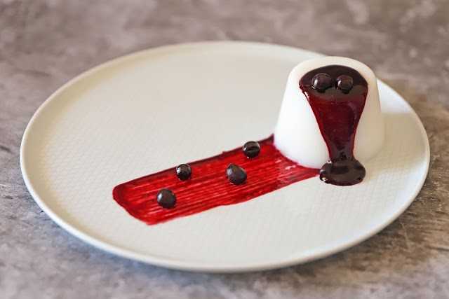 Σερβίρουμε την πανακότα καρύδας με κουλί φραγκοστάφυλο και λίγα φρέσκα φραγκοστάφυλα από πάνω.