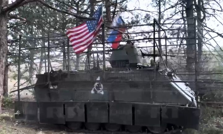 Σε βίντεο, που τραβήχτηκε κοντά στο χωριό Μαλάγια Τοκμάτσκα, στην περιοχή Ζαπορόζιε της Ρωσίας, φαίνονται στρατιώτες να οδηγούν το αμερικανικής κατασκευής τεθωρακισμένο όχημα M113 –που είχε εγκαταλειφθεί από ουκρανικά στρατεύματα– διακοσμημένο με ρωσικές και αμερικανικές σημαίες.