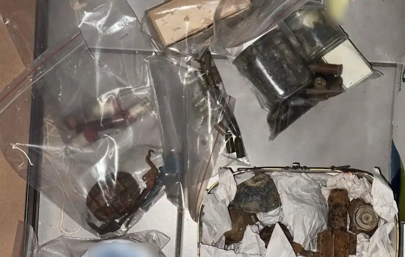 Πιο συγκεκριμένα, μέσα στον κάδο εντοπίστηκαν: 2 μοχλοί απελευθέρωσης χειροβομβίδας arges σε οξειδωμένη μορφή, 1 αμυντική χειροβομβίδα με πυροδοτικό, 10 κεφαλές βλημάτων όλμου οξειδωμένες, διάφορα υπολείμματα από βλήματα όλμου, φυσίγγια διαφορετικών διαμετρημάτων, ένα αποσυναρμολογημένο όπλο χειρός 22mm, διάφορα οξειδωμένα εξαρτήματα όπλων του Β’ Παγκοσμίου Πολέμου, 3 κορμοί από περίστροφα, ένας σιδερένιος κορμός από υποπολυβόλο Thomson, φυσιγγιοθήκες, κλείστρα από όπλα της ίδιας εποχής, κορμός από οξειδωμένο πολυβόλο αγνώστου τύπου, 2 σιδερογροθιές, 1 ζευγάρι χειροπέδες, δύο πτυσσόμενα γκλομπ, διάφορα εξαρτήματα οπλισμού και 14 θρησκευτικές εικόνες.