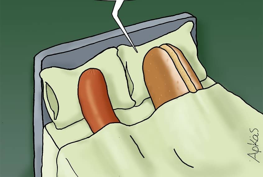 Στο καρέ βλέπουμε ένα κρεβάτι στο οποίο «κοιμούνται» αγκαλιά ένα λουκάνικο και ένα ψωμάκι. Ο διάλογος όμως αποκαλύπτει την αληθινή σάτιρα: