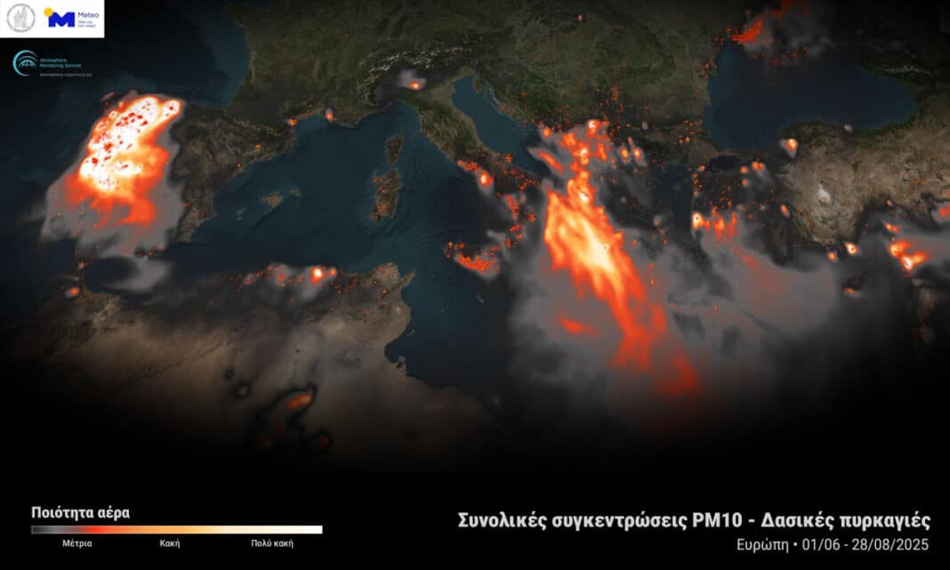 Η ποιότητα του αέρα σε περιοχές της Μεσογείου ήταν ιδιαίτερα επιβαρυμένη το καλοκαίρι του 2025, λόγω των εκτεταμένων δασικών πυρκαγιών, σύμφωνα με ανάλυση της μονάδας METEO του Εθνικού Αστεροσκοπείου Αθηνών.