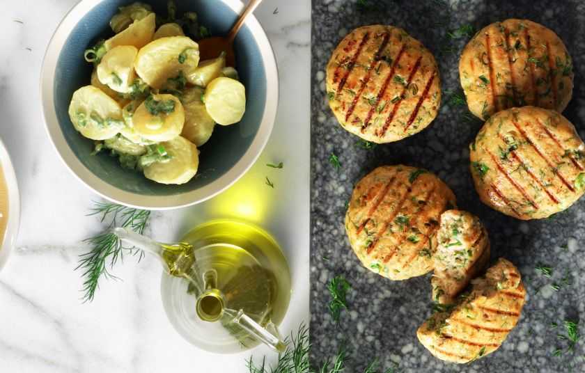 Προθερμαίνουμε τον φούρνο στο γκριλ. Σε ένα ξύλο κοπής ψιλοκόβουμε όσο γίνεται το ψάρι, μέχρι να γίνει σαν χοντροκομμένος κιμάς. Για ευκολία, μπορούμε να το κόψουμε σε φέτες και να τις ψιλοκόψουμε λίγες λίγες στο μούλτι. Σε ένα βαθύ μπολ ρίχνουμε όλα τα υλικά για τα ψαρομπιφτέκια και τα ζυμώνουμε μέχρι να σχηματιστεί ένα σφιχτό μείγμα που να πλάθεται. Αν χρειαστεί, μπορούμε να προσθέσουμε 1-2 κουτ. σούπας σιμιγδάλι επιπλέον. Πλάθουμε σε μεγάλα μπιφτέκια (περίπου 150 γρ. το καθένα) και τα βάζουμε σε λαδωμένο ταψί. Ψήνουμε στο ψηλότερο ράφι κάτω από το γκριλ, για περίπου 3-4 λεπτά από κάθε πλευρά, μέχρι να ροδίσουν. Συνοδεύουμε με πατάτες βραστές και πράσινη σαλάτα.
