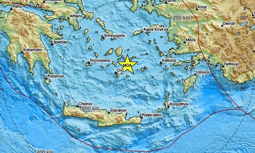 Το ακριβές επίκεντρο τη δόνησης εντοπίζεται στα 42 χλμ. βορειοανατολικά από την Οία.