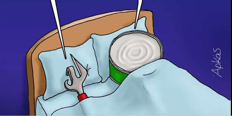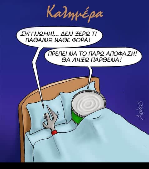 Στο σημερινό του σκίτσο βλέπουμε ένα κρεβάτι, όπου ξαπλωμένοι δίπλα-δίπλα βρίσκονται ένα ανοιχτήρι και μια κονσέρβα. Το ανοιχτήρι, εμφανώς σε δύσκολη θέση, λέει: «Συγγνώμη… δεν ξέρω τι παθαίνω κάθε φορά!», ενώ η κονσέρβα, απογοητευμένη αλλά με μια δόση ειρωνείας, απαντά: «Πρέπει να το πάρω απόφαση! Θα λήξω παρθένα!».