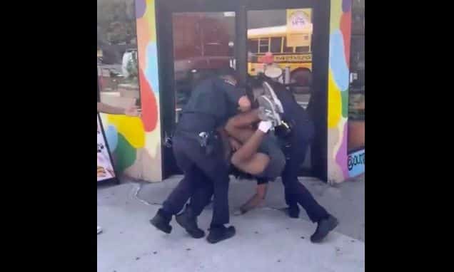 Στο βίντεο φαίνονται οι δύο από τους αστυνομικούς να αρπάζουν τα χέρια του 18χρονου, ενώ ένας τρίτος αστυνομικός τον ρίχνει με δύναμη στο έδαφος. Στη συνέχεια, οι τρεις αστυνομικοί τραβούν τα μαλλιά του ποδηλάτη και ένας από αυτούς πιέζει το γόνατό του στο κεφάλι του, πριν τελικά τον δέσουν με χειροπέδες και τον οδηγήσουν σε ένα περιπολικό που τους περίμενε.