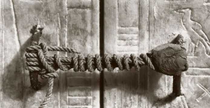 Αυτή η φωτογραφία τραβήχτηκε από τον Harry Burton το 1923. Δείχνει μια ανέπαφη σφραγίδα από σχοινί που ασφαλίζει τις θύρες στο δεύτερο από τα τέσσερα ιερά στον τάφο του Τουταγχαμών.
