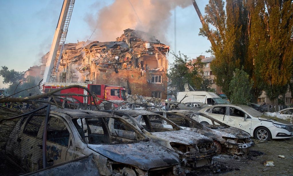 Ο δήμαρχος της πόλης, Βιτάλι Κλίτσκο, ανακοίνωσε ότι στη συνοικία Νταρνίτσκι ένα τετραώροφο κτίριο τυλίχθηκε στις φλόγες από πτώση συντριμμιών drones που καταρρίφθηκαν. Η έγκυος και δύο ακόμη τραυματίες μεταφέρθηκαν σε νοσοκομείο, ενώ στη συνοικία Σβιατοσίνσκι συντρίμμια προκάλεσαν φωτιές σε μία 16ώροφη και δύο 9ώροφες πολυκατοικίες.