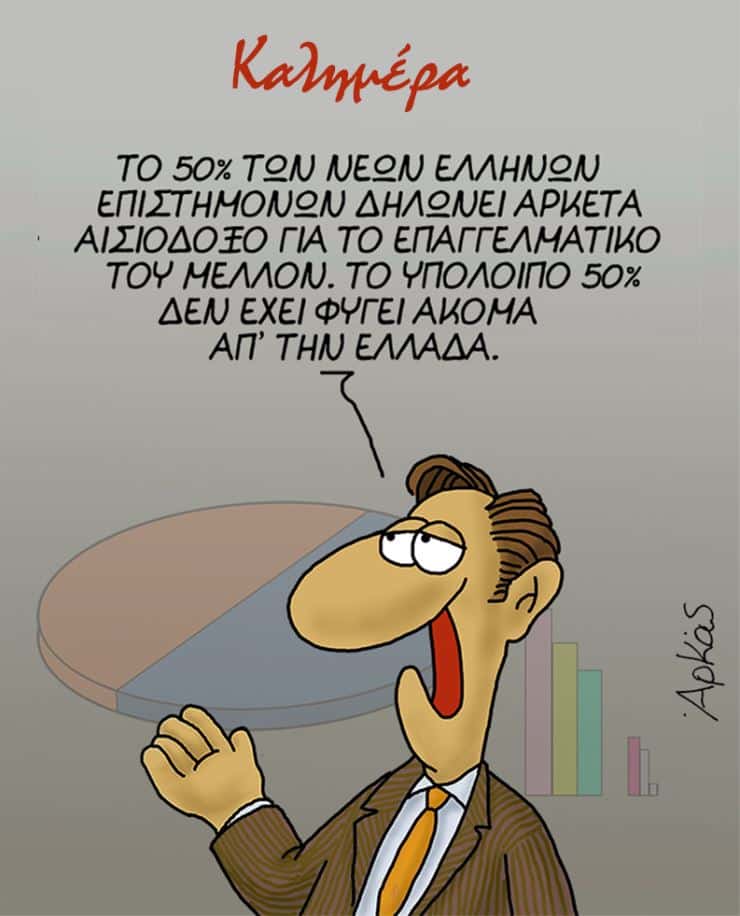 Με το καυστικό του χιούμορ και την αλήθεια που κρύβεται πίσω από τις λέξεις, ο Αρκάς, μάς  καλημερίζει με ένα σκίτσο που προκαλεί γέλιο, αλλά και έντονο προβληματισμό για την κατάσταση της εργασίας και των νέων επιστημόνων στην Ελλάδα.