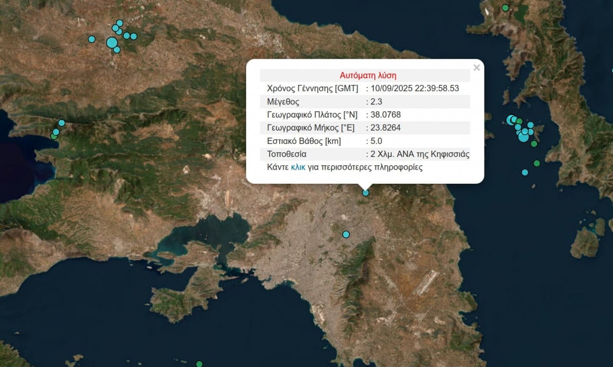 Ασθενής σεισμική δόνηση μεγέθους 2,3 βαθμών της κλίμακας Ρίχτερ, σύμφωνα με την αυτόματη λύση του Γεωδυναμικού Ινστιτούτου του Αστεροσκοπείου Αθηνών, σημειώθηκε στις 01:53 μετά τα μεσάνυχτα (Πέμπτη 11/9) σε περιοχή των βορείων προαστίων Αττικής.