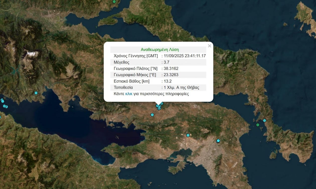 Το ακριβές επίκεντρο τη δόνησης εντοπίζεται στo 1 χλμ. ανατολικά της Θήβας.