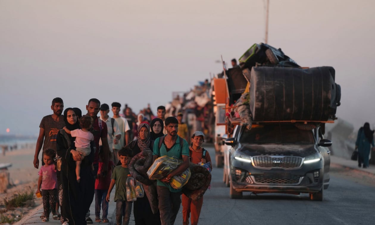 Σε έναν σκονισμένο δρόμο ανάμεσα στα ερείπια μια συνεχής ροή ανθρώπων που απομακρύνονται από την πόλη της Γάζας και κατευθύνονται προς τον νότο: κάποιοι στοιβαγμένοι σε φορτηγάκια ή κάρα, άλλοι με τα πόδια κρατώντας στα χέρια τους τσάντες ή μικρά παιδιά.